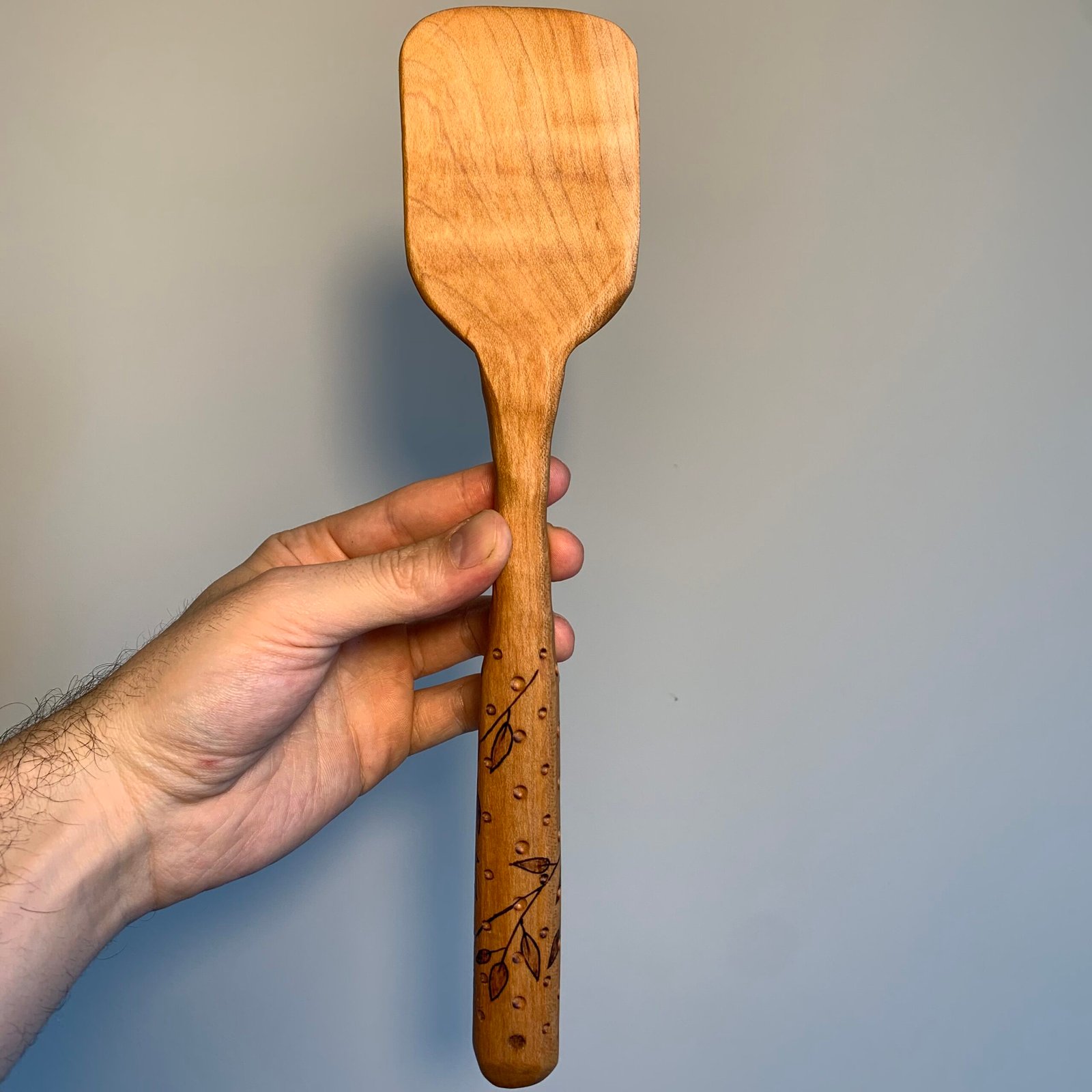 This is a hand-made wooden spatula with burnt floral engraving and a dimpled texture. It has an ergonomically designed handle for a comfortable feel. Add this utensil to your cooking arsenal for an eco-friendly option with zero microplastics.  The hardwood is locally sourced and reclaimed whenever possible.